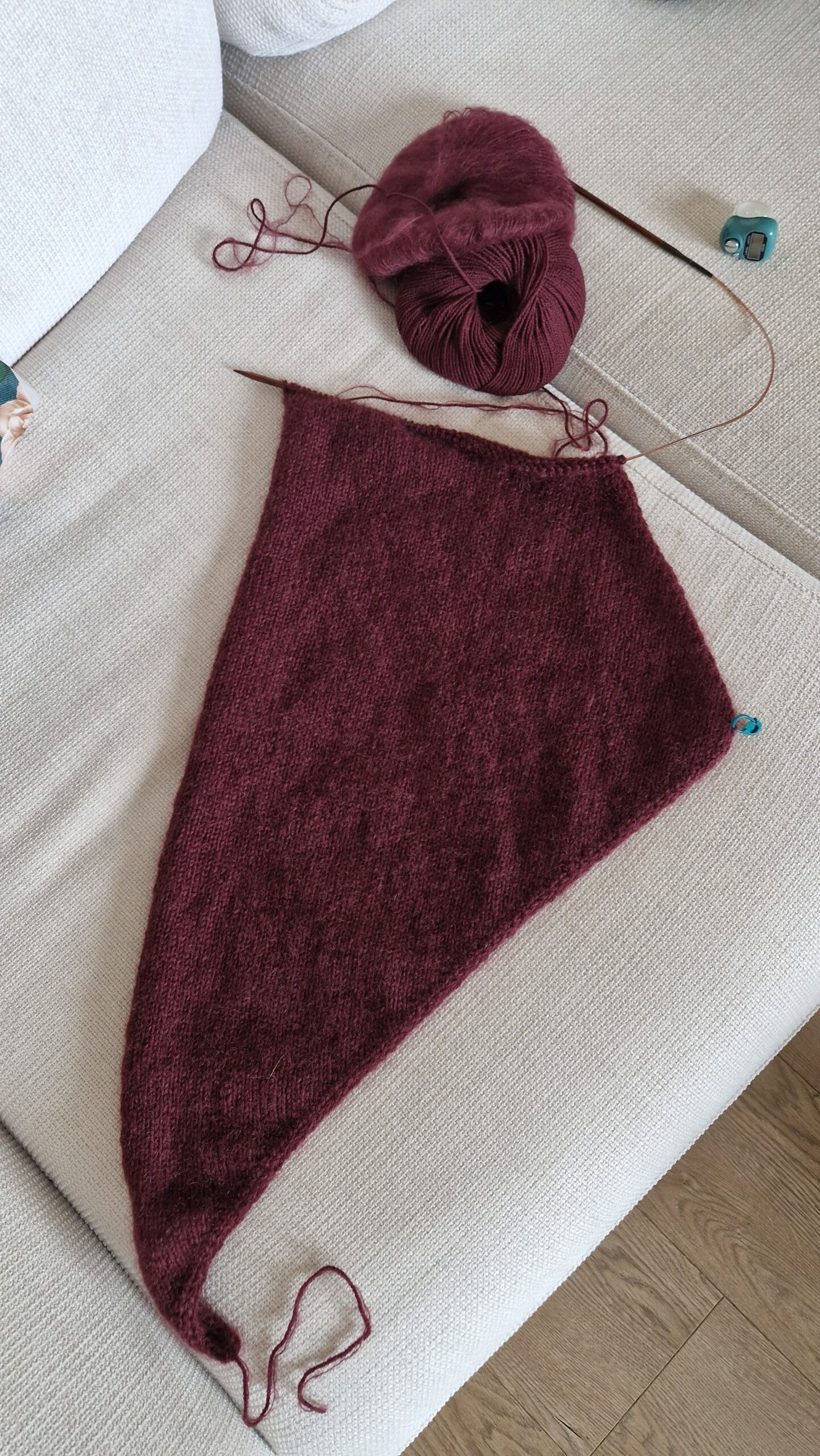 (Podane zapotrzebowanie nie obejmuje próbki. Jeśli planujesz zmiany, np. wydłużenie chusty lub wykonanie dodatkowych próbek, których nie zamierzasz pruć, zamów po dodatkowym motku włóczki).